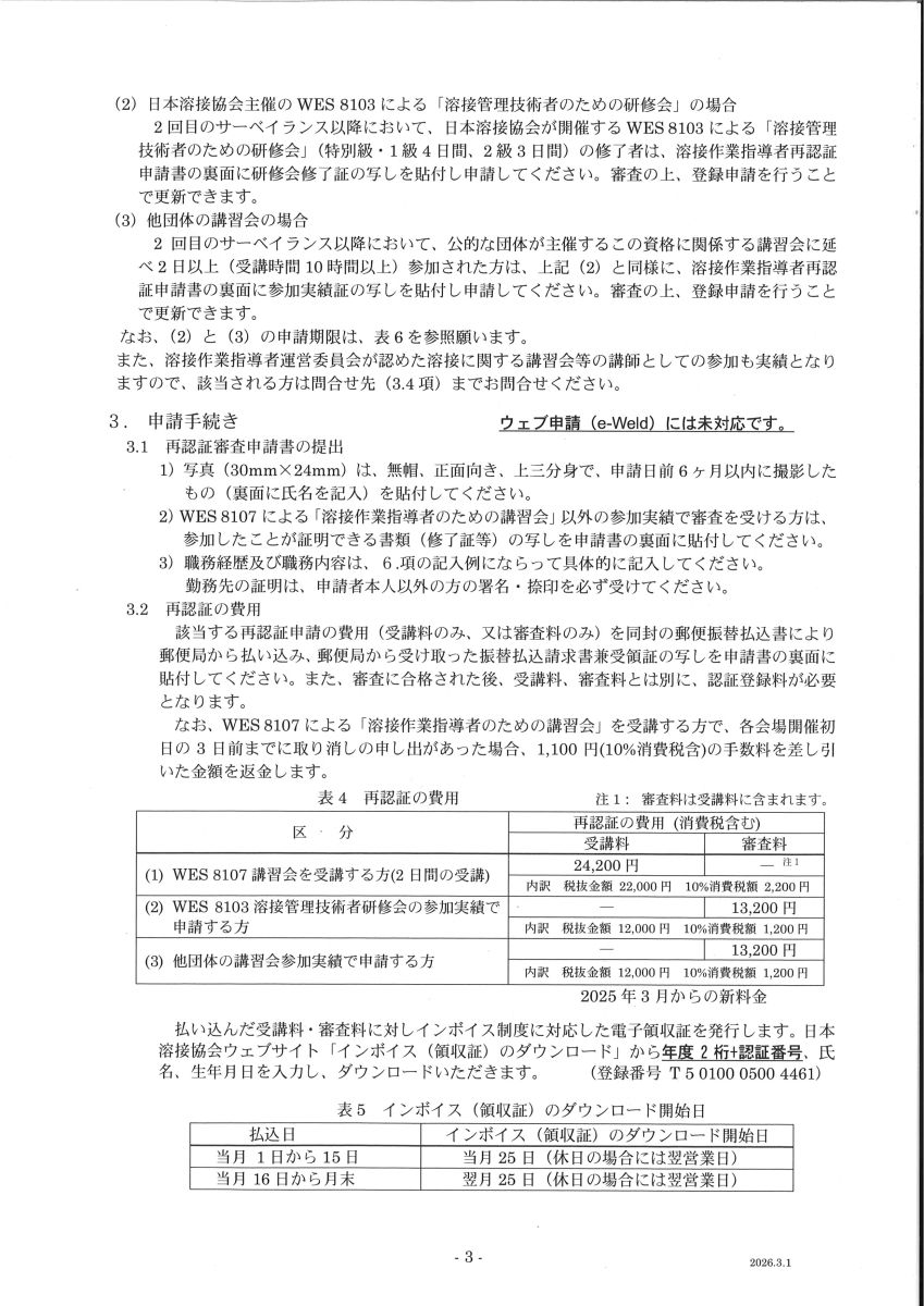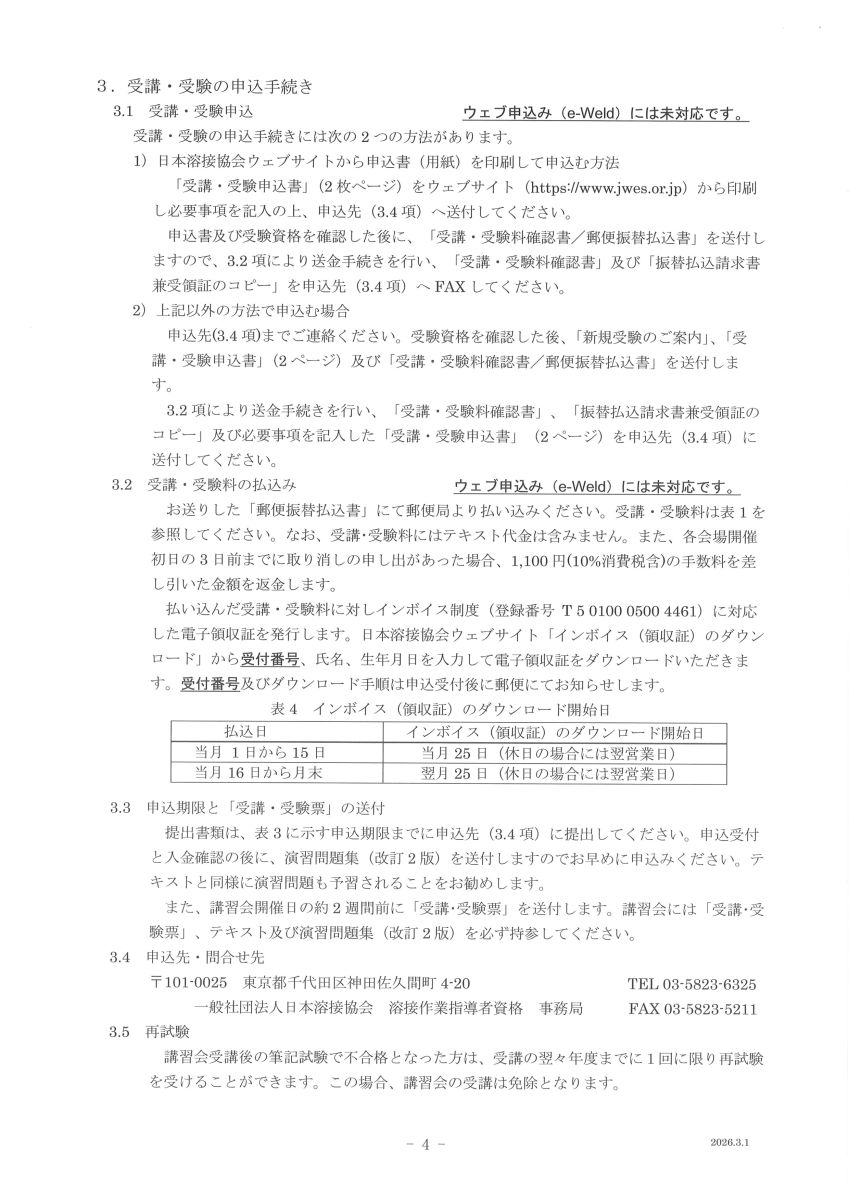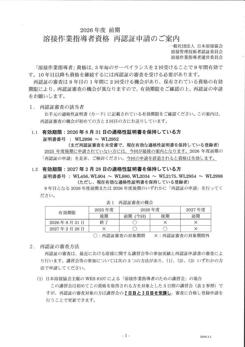 溶接作業指導者資格について、新規受験・再認証につきましては、e-Weld ウエブ申し込みには対応しておりません。